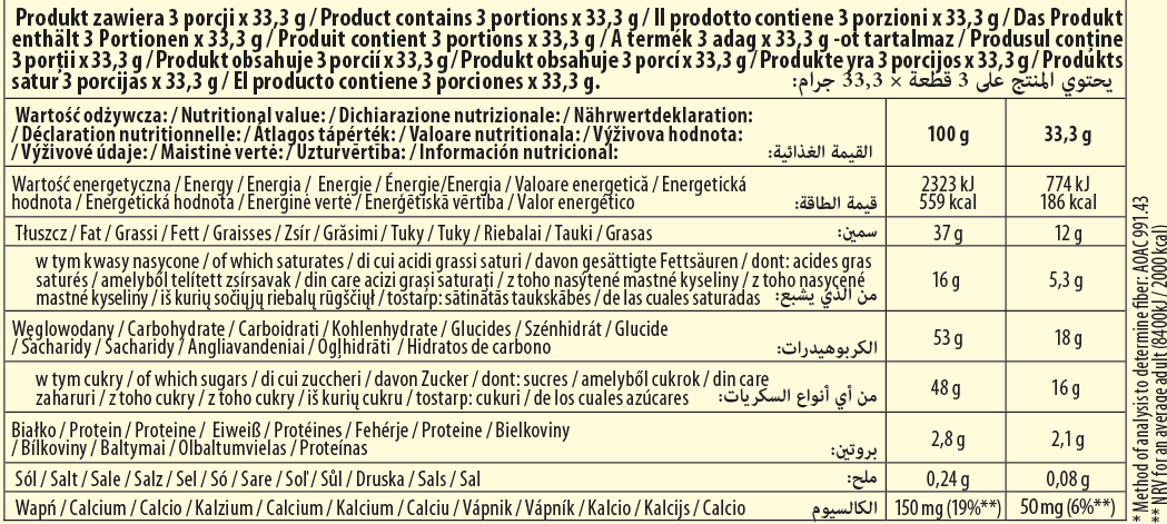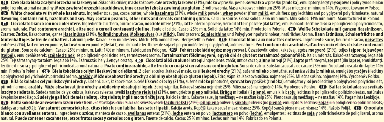 Składniki: cukier, całe orzechy laskowe (21%), masło kakaowe, mleko w proszku pełne, serwatka w proszku (z mleka), emulgatory: lecytyny sojowe i polirycynooleinian poliglicerolu, aromat naturalny. Może zawierać orzeszki arachidowe, inne orzechy i zboża zawierające gluten. Źródło wapnia. Masa kakaowa: minimum 25%. Masa mleczna: minimum 14%. Wyprodukowano w Polsce.