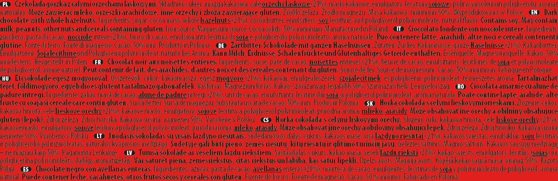Czekolada zawiera: 50% kakao, orzechy laskowe (21%).