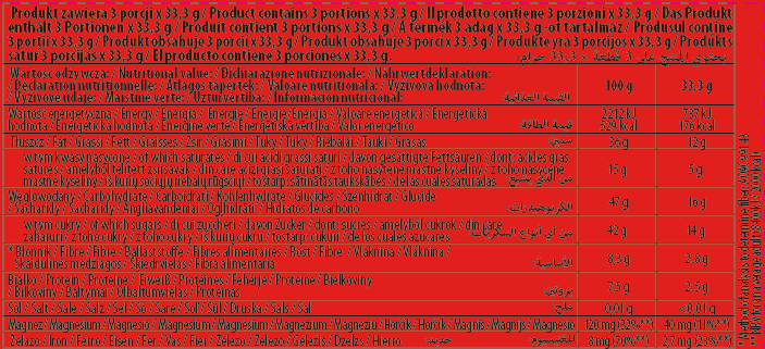 naturalny. Może zawierać mleko, orzeszki arachidowe, inne orzechy i zboza zawierajace gluten. Źródło żelaza. Żródło magnezu. Masa kakaowa: minimum 50%. Wyprodukowano w Polsce.