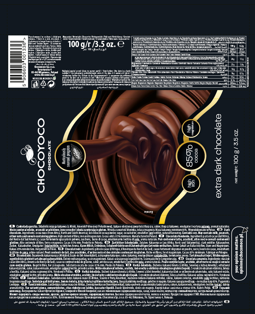 Najwyżej jakości czekolada Chocoyoco o zawartości kakao min. 85% z fabryki czekolady Chocomoco. Starannie wyselekcjonowane kakao w oparciu o program Meticulously sourced™, długi proces konszowania oraz opracowany do perfekcji proces temperowania powodują że czekolada gorzka rozpływa się w ustach. Produkt zawiera wysoką zawartość błonnika, żelaza i magnezu.