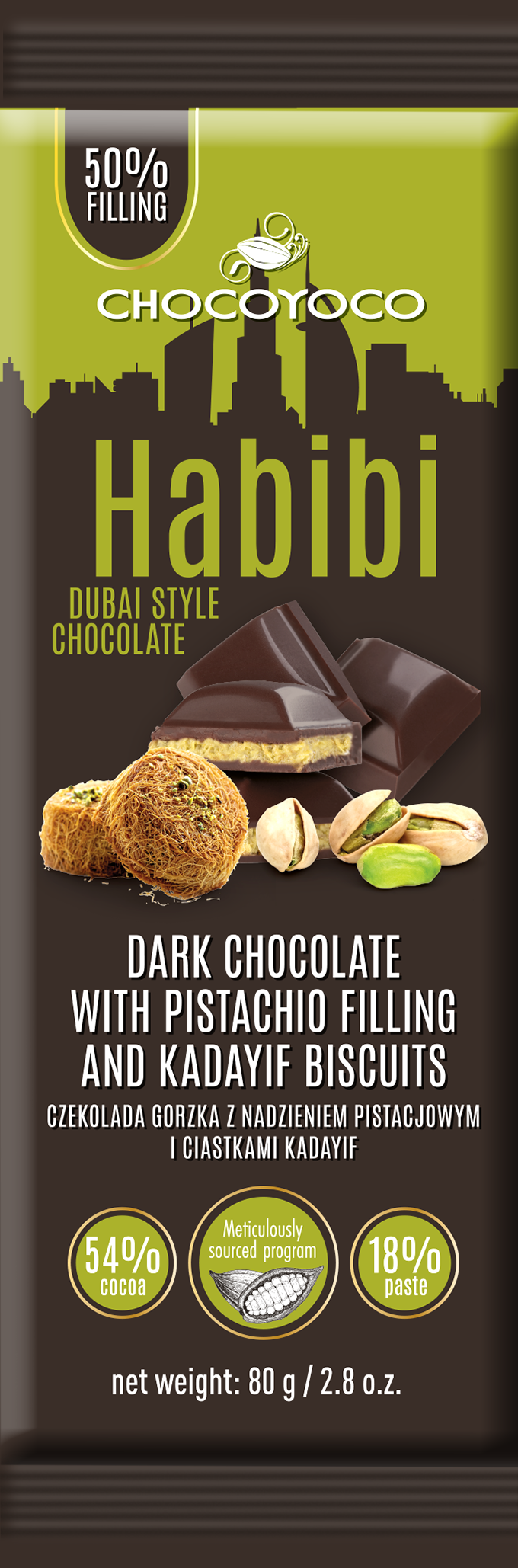 Chocomoco fabryka czekolady przedstawia nowość. Czekoladę gorzką z nadzieniem pistacjowym i ciastkami Kadayif w nowej grubszej tabliczce. Produkt w oparciu o autorski program rozwoju: Meticulously sourced™. Nasze produkty eksportujemy do ponad 30 krajów na całym świecie.