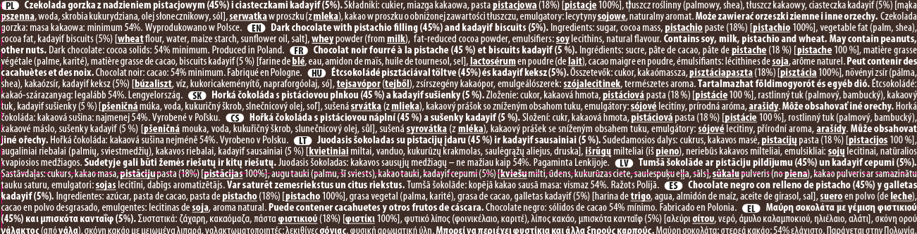 Czekolada gorzka z nadzieniem pistacjowym (45%) i ciastkami Kadayif. Składniki: cukier, miazga kakaowa, pasta pistacjowa (18%) [pistacje 100%], tłuszcz roslinny (palmowy, shea), tłuszcz kakaowy, ciasteczka kadayif (5%) [mąka pszenna, woda, skrobia kukurydziana, olej słonecznikowy, sól], serwatka w proszku (z mleka), kakao w proszku o obnizonej zawartosci tłuszczu, emulgatory: lecytyny sojowe, naturalny aromat. Może zawierać orzeszki arachidowe, inne orzechy. Masa kakaowa: minimum 54%. Wyprodukowano w Polsce.