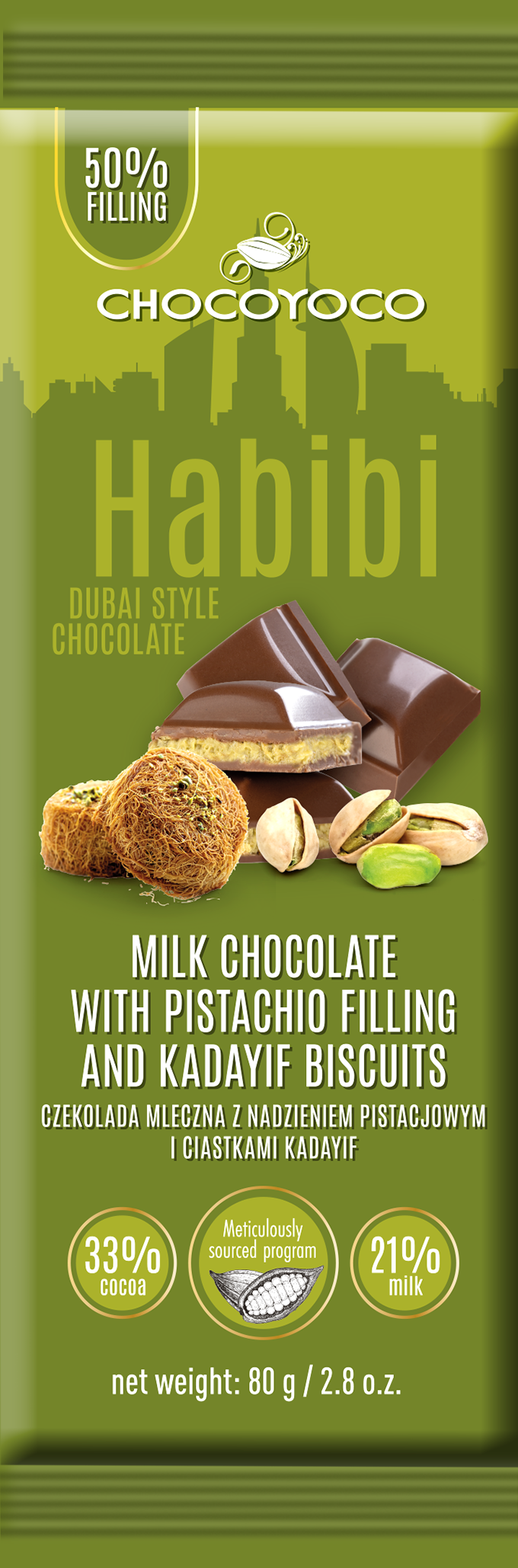 Chocomoco fabryka czekolady przedstawia nowość. Czekoladę mleczną z nadzieniem z pistacji i ciastkami Kadayif w nowej grubszej tabliczce. Produkt w oparciu o autorski program rozwoju: Meticulously sourced™. Nasze produkty eksportujemy do ponad 30 krajów na całym świecie.