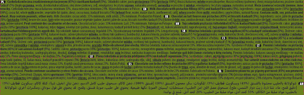 Czekolada mleczna z nadzieniem pistacjowym (45%) i ciastkami Kadayif. Składniki: cukier, pasta pitsacjowa (18%) [pistacja 100%], tłuszcz kakaowy, mleko w proszku pełne, serwatka w proszku (z mleka), prażone ciastka Kadayif (5%) [mąka pszenna, woda, skrobia kukurydziana, olej słonecznikowy, sól], emulgatory: lecytyny sojowe, aromat naturalny. Może zawierać orzeszki arachidowe, inne orzechy. Masa kakaowa: minimum 33%. Masa mleczna: minimum 21%. Wyprodukowano w Polsce.