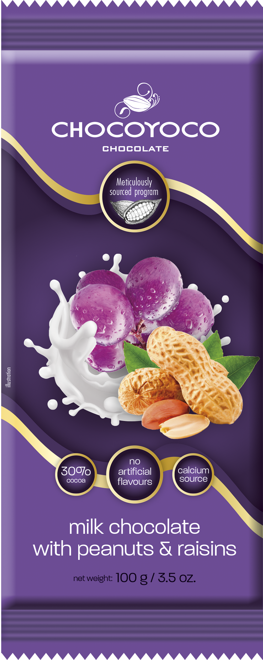 Chocomoco fabryka czekolady przedstawia czekoladę mleczną z orzeszkami ziemnymi i rodzynkami. Produkt w oparciu o autorski program rozwoju: Meticulously sourced™. Nasze produkty eksportujemy do ponad 30 krajów na całym świecie.