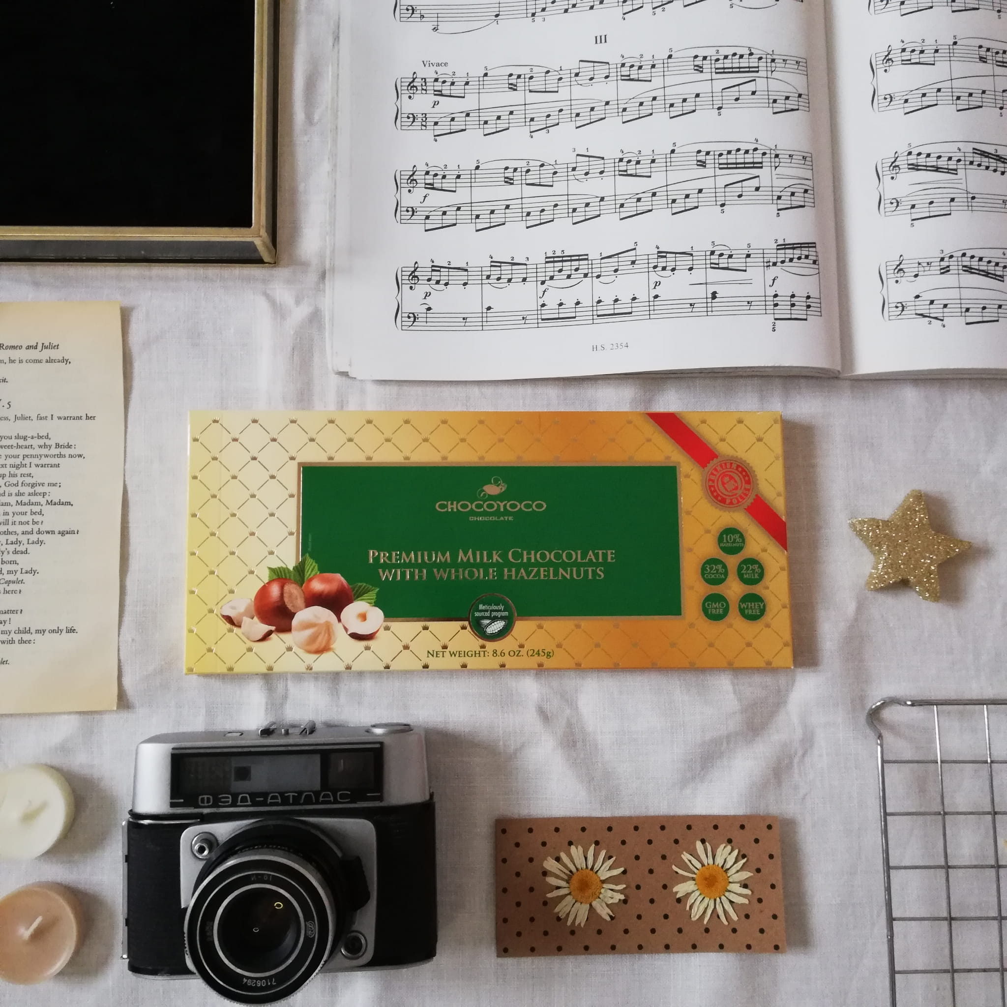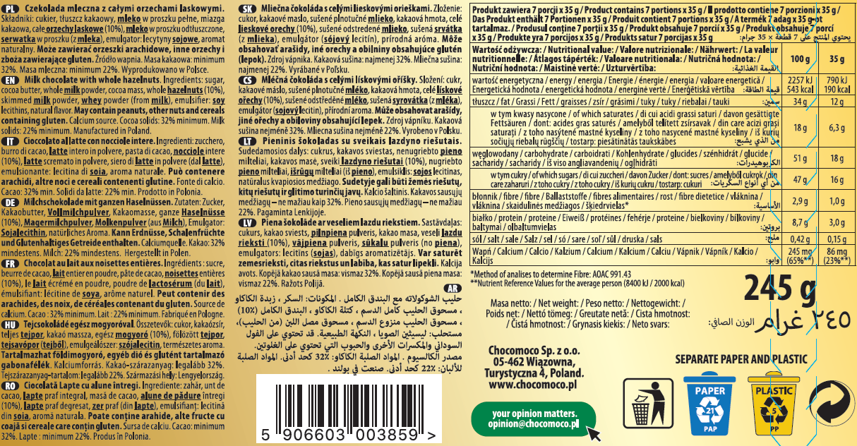Składniki: cukier, tłuszcz kakaowy, mleko w proszku pełne, miazga kakaowa, całe orzechy laskowe (10%), mleko w proszku odtłuszczone, serwatka w proszku (z mleka), emulgator: lecytyny sojowe, aromat naturalny. Może zawierać orzeszki arachidowe, inne orzechy i zboża zawierające gluten. Źródło wapnia. Masa kakaowa: minimum 32%. Masa mleczna: minimum 22%. Wyprodukowano w Polsce.