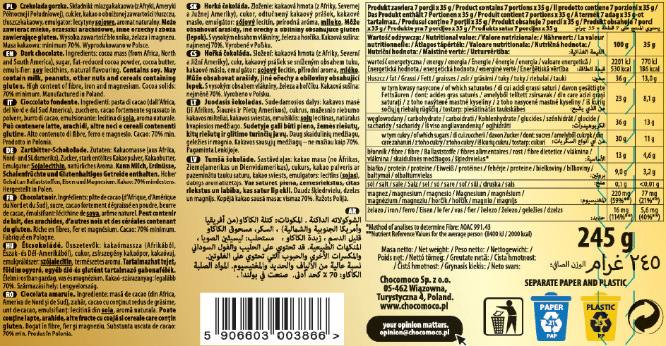 Składniki: miazga kakaowa, cukier, kakao o obniżonej zawartości tłuszczu, tłuszcz kakaowy, emulgatory: lecytyny sojowe, naturalny aromat. Może zawierać mleko, orzeszki ziemne, inne orzechy i zboża zawierające gluten. Masa kakaowa: min. 70%. Wyprodukowano w Polsce.