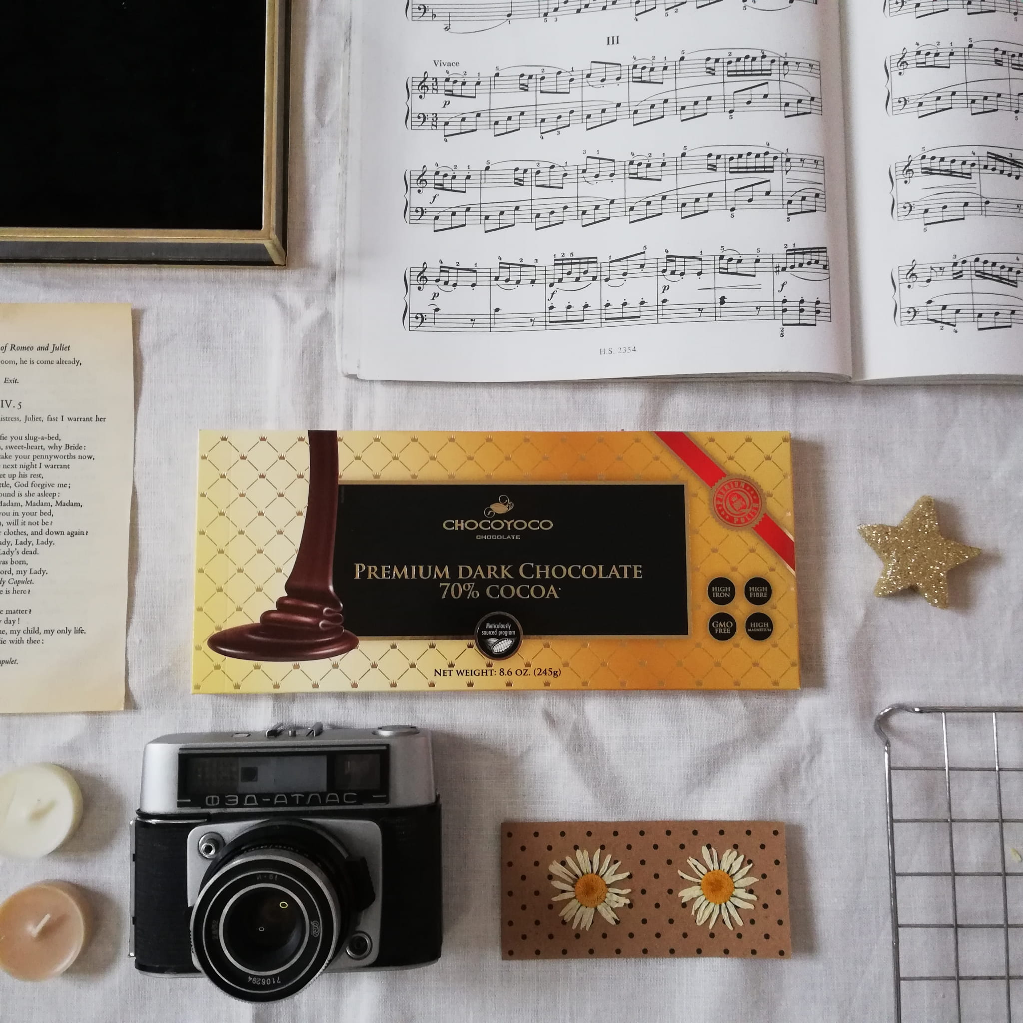 Najwyżej jakości czekolada Chocoyoco Premium o zawartości kakao min. 70% z fabryki czekolady Chocomoco. Starannie wyselekcjonowane kakao w oparciu o program Meticulously sourced™, długi proces konszowania oraz opanowany do perfekcji proces temperowania powodują że czekolada gorzka rozpływa się w ustach. Produkt zapakowany w elegancki, pozłacany kartonik, może stanowić piękny prezent dla bliskiej osoby.