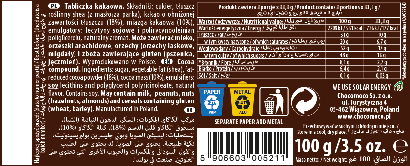 Składniki: cukier, tłuszcz roślinny shea (z masłosza parka), odtłuszczone kakao w proszku (18%), miazga kakaowa (10%), emulgatory: lecytyny sojowe i polirycynooleinian poliglicerolu, aromat naturalny. Może zawierać mleko, orzeszki arachidowe, inne orzechy i zboża zawierające gluten. Wyprodukowano w Polsce.