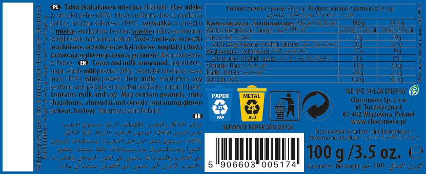 Chocomoco fabryka czekolady przedstawia: Tabliczka kakaowo-mleczna z 20% zawartością pełnego mleka w proszku. Produkt w oparciu o autorski program rozwoju: Meticulously sourced™. Nasze produkty eksportujemy do ponad 30 krajów na całym świecie.